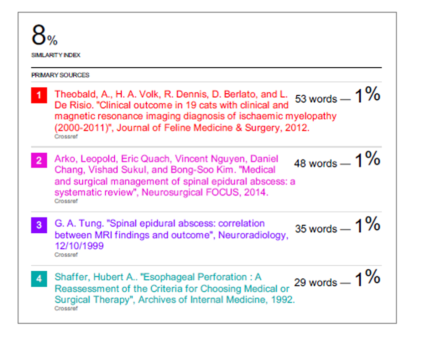 iThenticate/CrossCheck 论文查重检测 iThenticate/CrossCheck 论文查重检测 50元/篇 (3000-20000单词)iThenticate 论文原创性检测(论文查重)(外文文章查重.针对外文SCI SSCI EI 期刊)iThenticate是Turnitin公司开发的全球最权威的论文原创性检测工具,有着世界上最大的对比数据库。国际主要出版机构(如:Elsevier, Springer, IEEE等)和大部分SCI期刊都使用iThenticate/CrossCheck审查稿件 iThenticate官网:https://www.ithenticate.com/